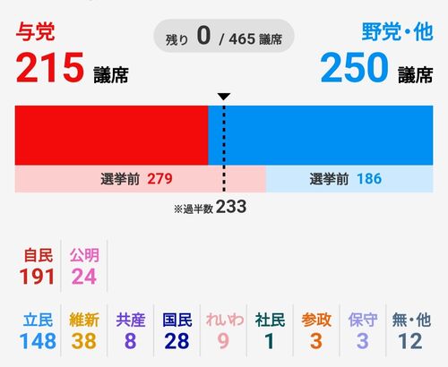 NHKニュースより 衆議院選は事前の予想以上の自民、公明党の惨敗に終わった。立憲民主党の伸びは予想どおりだが、目立ったのが国民民主党の急進。一桁からいきなり28議席というのは驚き。 比例区では名簿の候補者が足りず3人損したらしいので本当は31人にな…