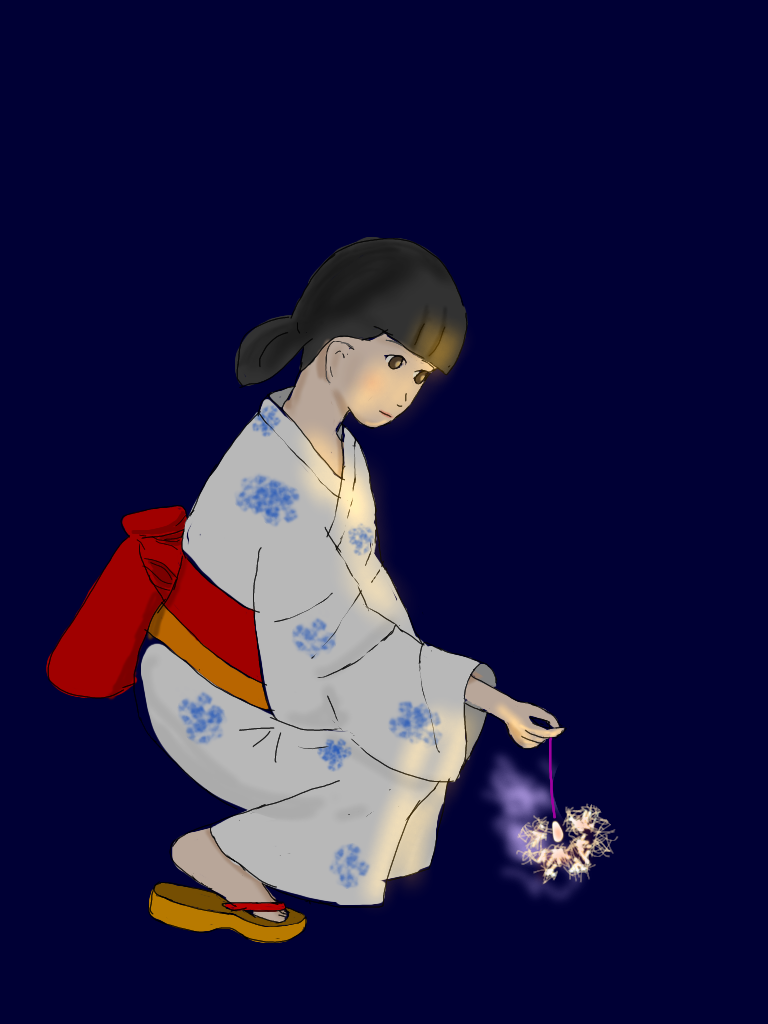 線香花火と浴衣の少女の絵が頭に浮かんだので描いてみた。下手だが、花火を見てもの思いに沈む少女の感じは出せたかも。
